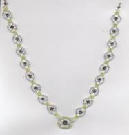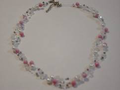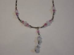 ローズクォーツとスワロのチェーンネックレス。クラッシックカジュアルです。ジーンズにもよく似合います。